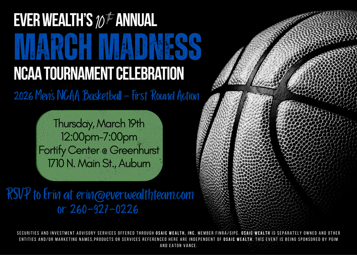 Get ready for an exciting day of college basketball at Ever Wealth’s 10th Annual March Madness Celebration! Join us for the first round of the 2026 Men’s NCAA Basketball Tournament and enjoy a fun, relaxed atmosphere with fellow clients and friends.